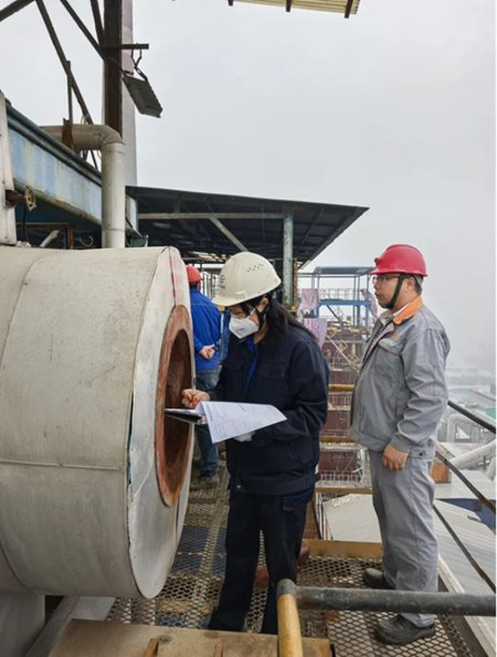 锅炉内部空间狭小、闷热潮湿,残留的粉尘与余热让作业环境格外艰苦,队员们身着厚重防护服,蜷缩身体穿梭在纵横交错的管道间,用超声波测厚仪逐段检测管壁厚度,用内窥镜探查隐蔽焊缝缺陷,不放过任何一处安全隐患。检验现场也是“传帮带”的课堂。党员骨干一边精准操作设备,一边向青年员工讲解余热锅炉常见缺陷特征与检测技巧,将“望外观、查参数、测厚度、探内部”的四步工作法倾囊相授。在党员骨干的示范引领下,队员们经过2天的连续奋战,顺利完成4台锅炉的检验,为万洋集团设备维护与生产复工赢得宝贵时间。“双节期间的检验服务太及时了,既没耽误生产,又消除了安全顾虑。”万洋集团设备负责人对队员们的高效与专业表示认可。