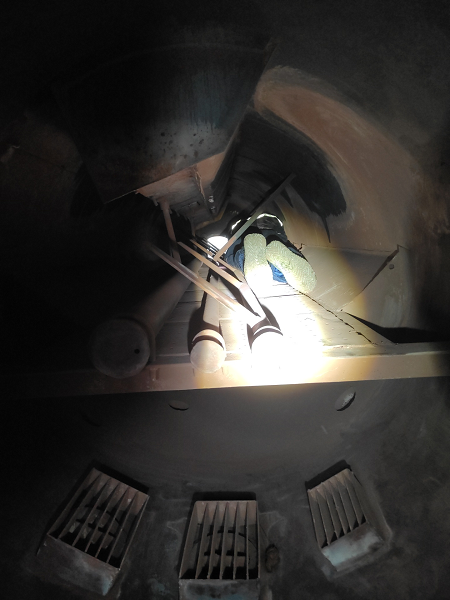 过程中,为探测准确数据,检验人员持仪器钻进狭小的孔道,丝毫不怕锅炉内部铁锈粘身,只为摸清锅炉内部情况,为锅炉作出正确评定。