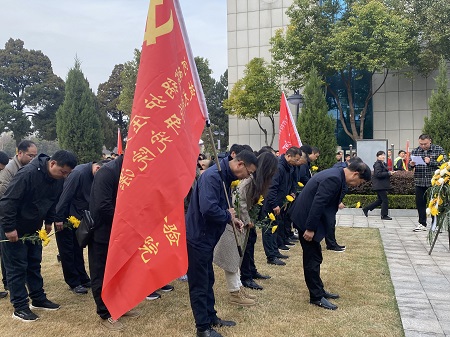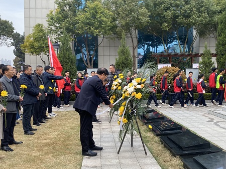 巍峨墓碑下,青松绿柏中,革命先烈们长眠于此。怀着无比崇敬的心情,全体干部职工佩戴党徽、整齐列队,向赵伊坪、王焯冉等烈士敬献花篮、致敬默哀。分院院长刘遂民代表分院向前敬献花篮,全体职工行三鞠躬礼,表达对革命先烈们的深切哀思和敬仰之情,接着一一敬献鲜花。